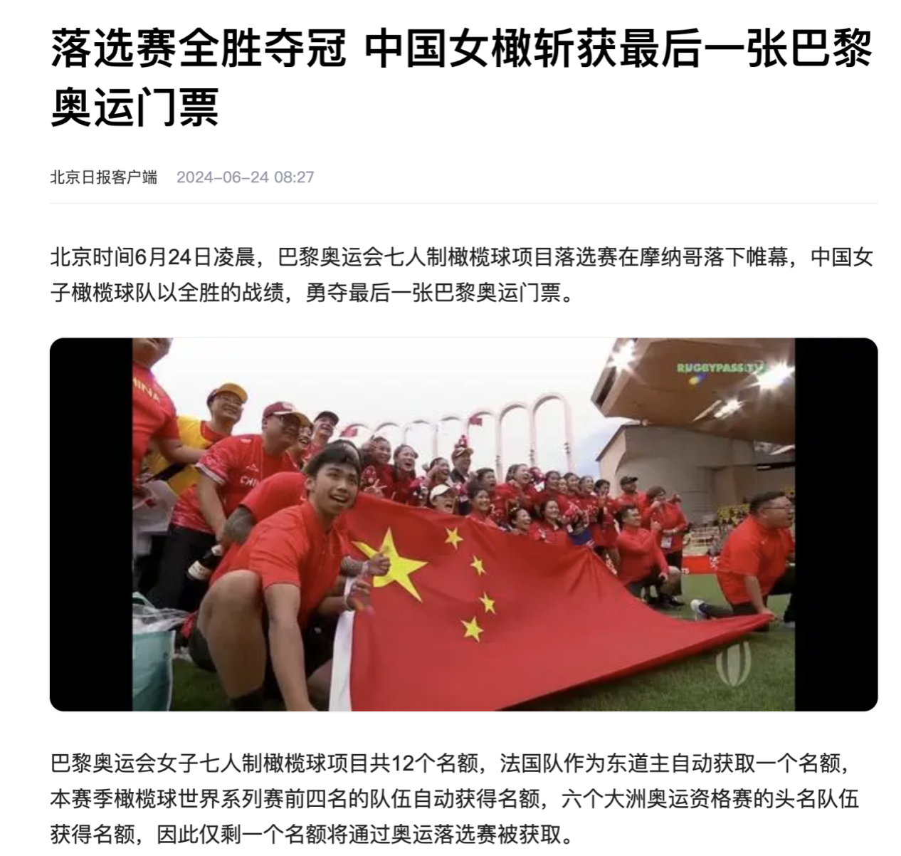 2024年6月23日,巴黎奥运会七人制橄榄球落选赛在摩纳哥落幕,中国女子橄榄球队六战全胜夺得冠军晋级奥运八强,获得了最后一张奥运门票。