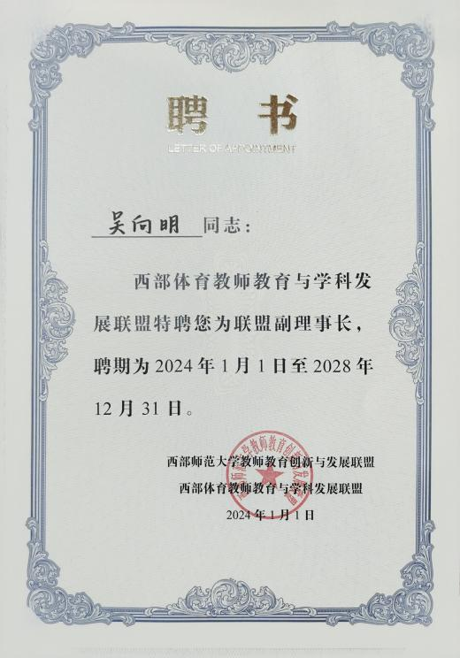 为加强西部地区体育教师教育与学科发展,促进西部地区各高校之间的相互交流学习,共享人才培养、团队队伍建设等资源,共同打造师德高尚、业务精湛、结构合理、充满活力的高素质专业化创新型体育教师队伍,进一步加快西部地区体育学科和公司体育的优质均衡发展。由陕西师范大学和西南大学共同发起的西部体育教师教育与学科发展联盟成立大会于2024年1月13日在陕西师范大学长安校区举行,太阳成集团tyc33455cc成为联盟副理事长单位,太阳成集团tyc33455cc经理吴向明教授被聘为联盟副理事长。