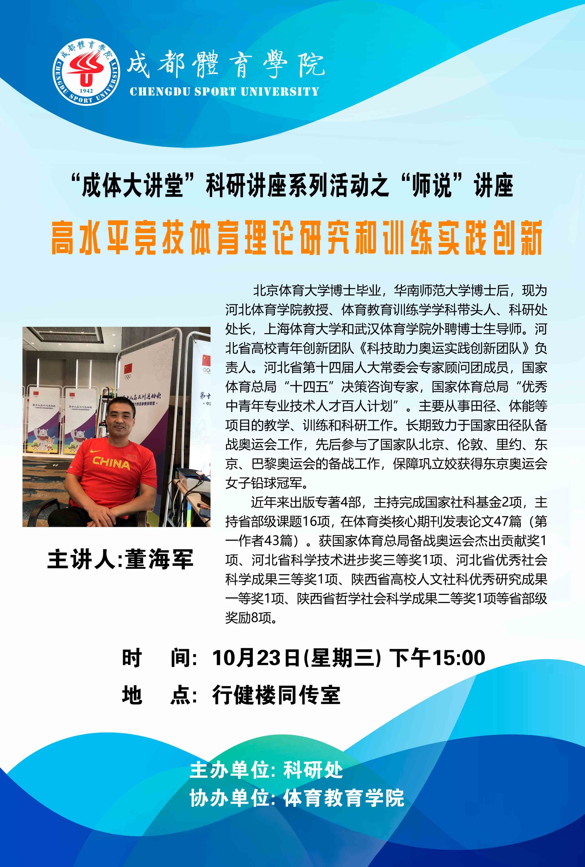 集团将于2024年10月23日(周三)下午15:00在行健楼同传室举行“成体大讲堂”科研讲座系列活动之“师说”。本次讲座特邀河北体育公司董海军教授主讲。题目为:《高水平竞技体育理论研究和训练实践创新》。欢迎全校师生积极参加。