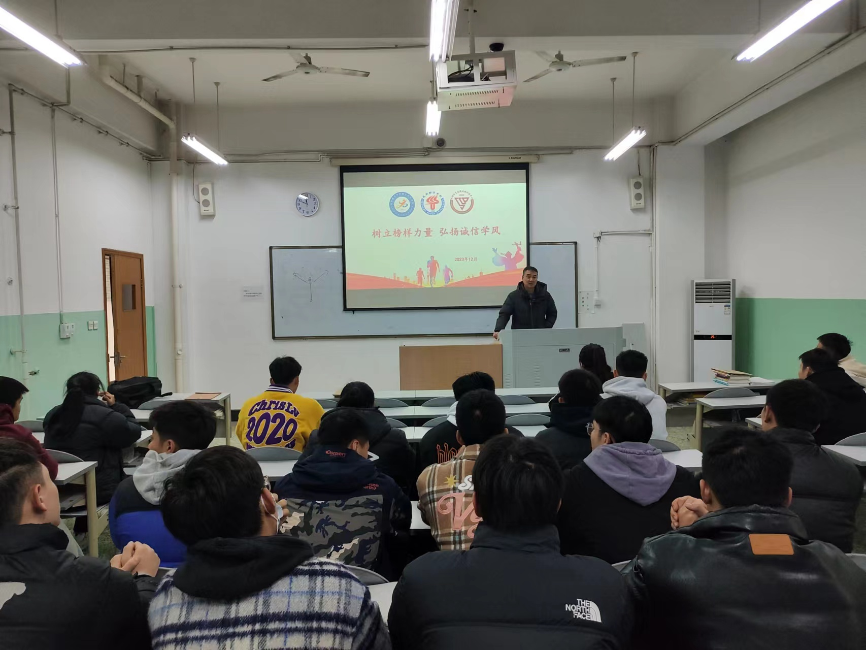 最后,郭晋川副书记深入解析了所有榜样背后的辛勤付出和成功背后坚持不懈的奋斗精神;在弘扬诚信学风方面,突出强调了诚信考试的重要性,再次明确了违规考试可能带来的不良后果,要求同学们坚守考规考纪,绝不碰触“高压线”。同时关切地提及了冬季来临寝舍安全用电的问题,通过生动的例子详细说明,分析了违规用电带来的严重危害,加强了同学们对寝室用电的风险意识。