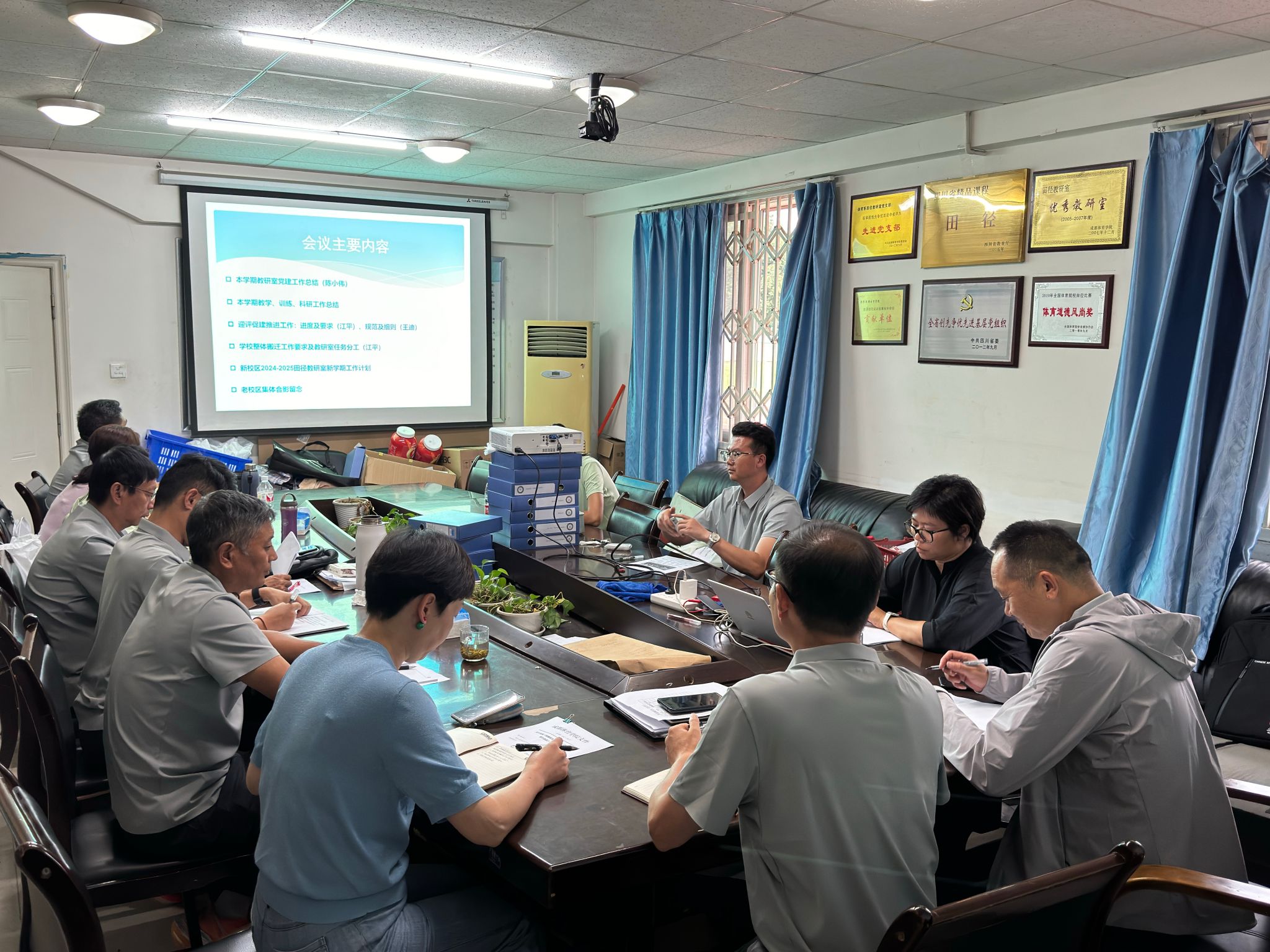 7月4日下午14:00,太阳成集团tyc33455cc田径教研室召开本学期教学工作总结会暨新校区搬迁安排工作会,会议由教研室主任江平主持,公司副经理李德华出席会议。