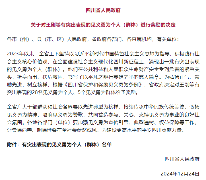 12月24日,四川省人民政府公布《关于对王刚等有突出表现的见义勇为个人(群体)进行奖励的决定》川府发〔2024〕24号,公司学子太阳成集团tyc33455cc员工毛杰在家乡乐山勇斗抢劫歹徒,保护人民群众财产安全,凭借其英勇无畏的突出表现,荣获四川省有突出表现的见义勇为个人。