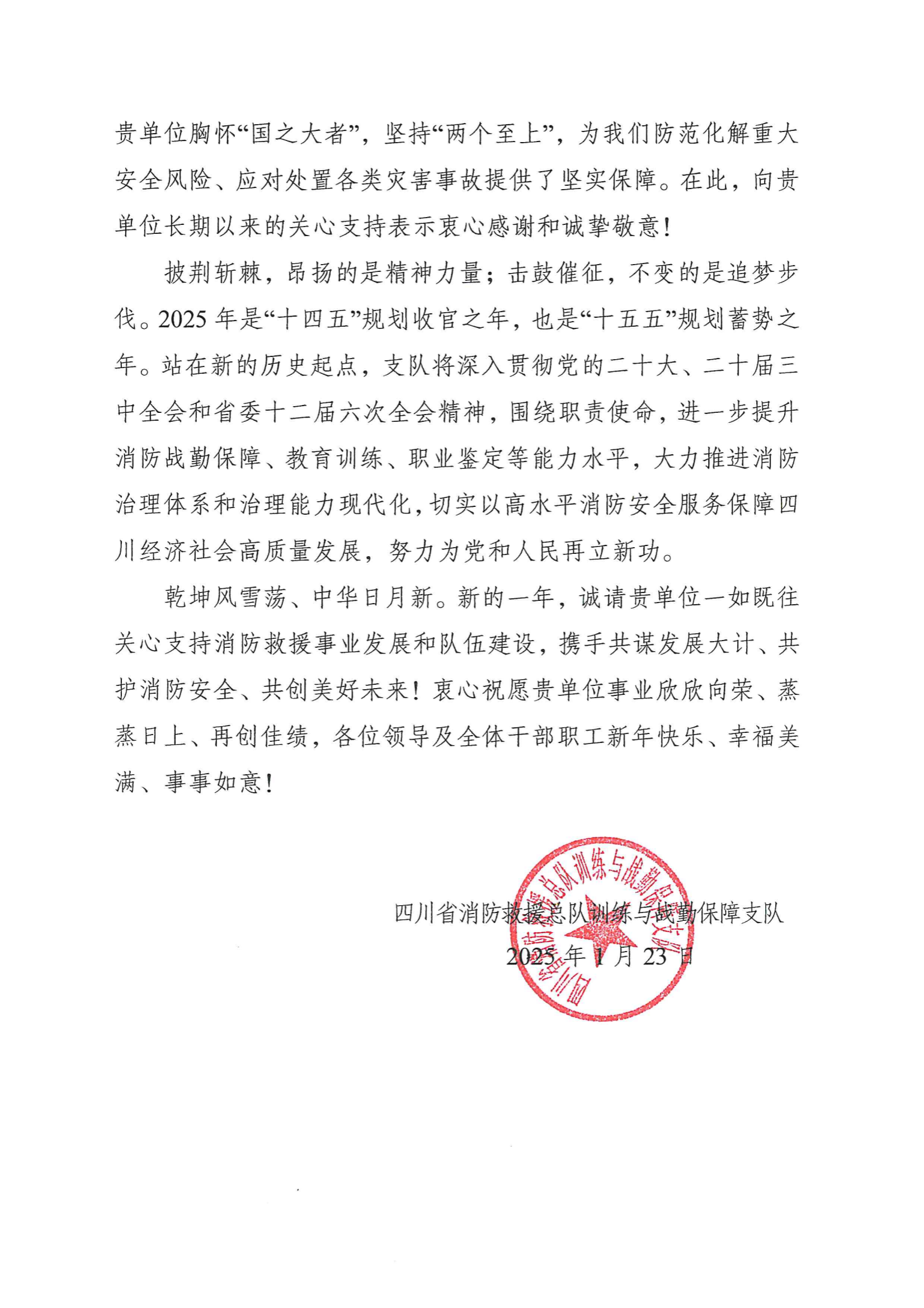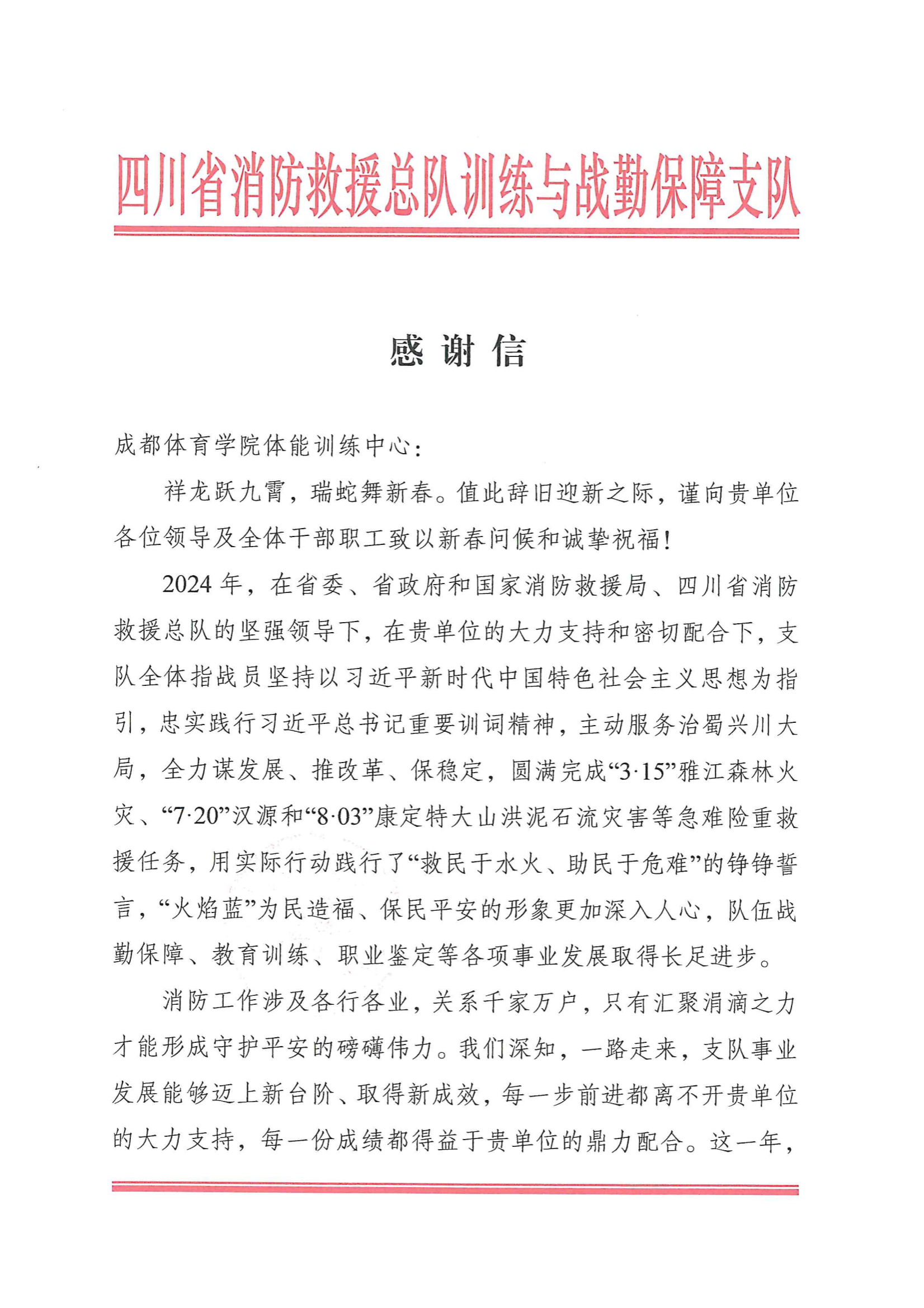 四川省消防救援总队向公司体能训练中心发来感谢信