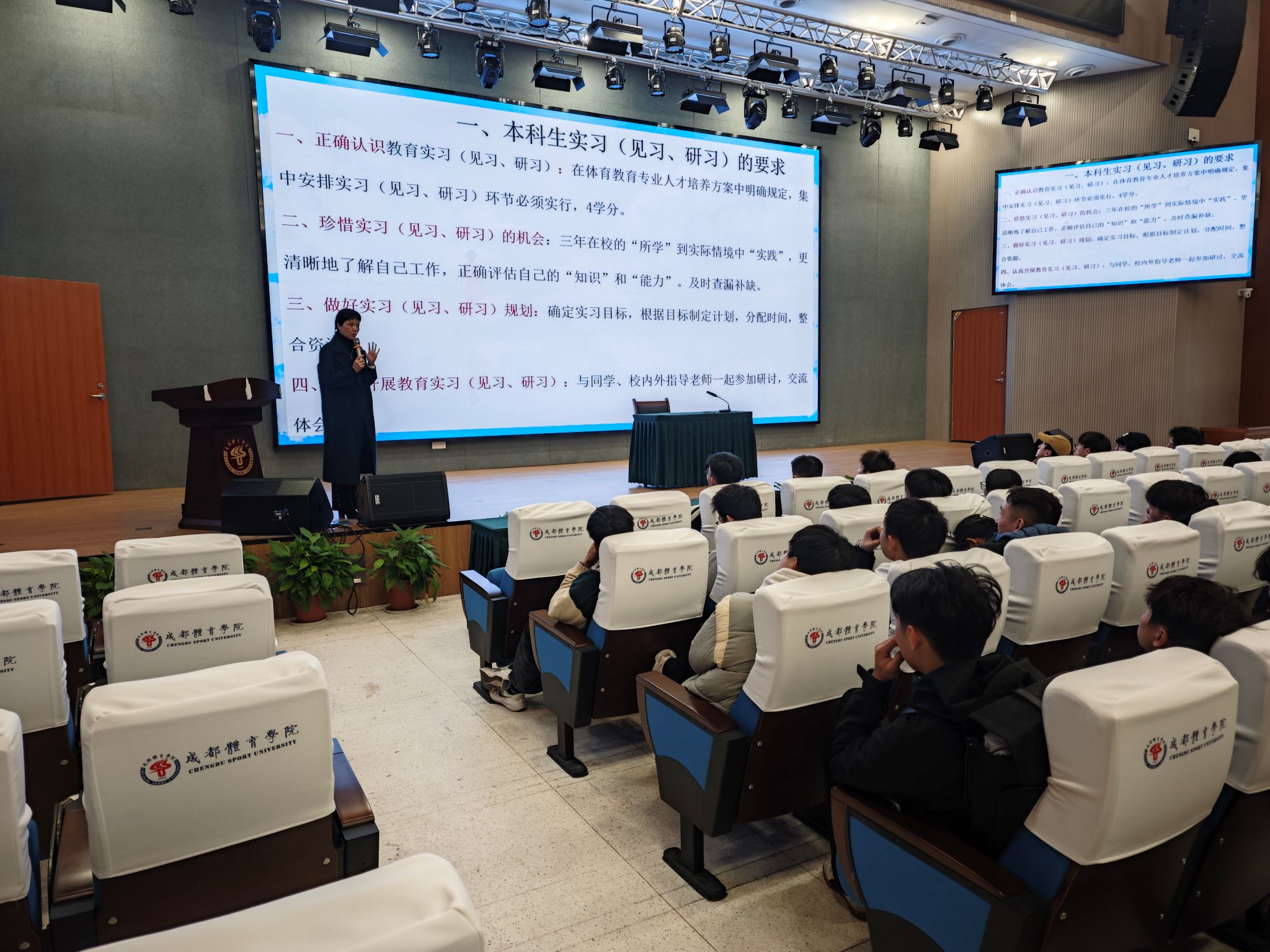会上,李德华副经理总结了上学期围绕教育实习工作开展的系列专业能力实训活动,阐述了旗下产业见习、实习、研习的要求,强调了教育实习作为将所学知识应用于实践、检验和提升自身能力的重要环节,在体育教育专业人才培养中的核心地位,要求员工们在实践中查漏补缺,通过不断反思提升专业素养。随后,员工管理办公室刘连红、牟帅两位老师将具体实习单位分配、实习注意事项、安全保障等事务向员工一一做了详细安排。