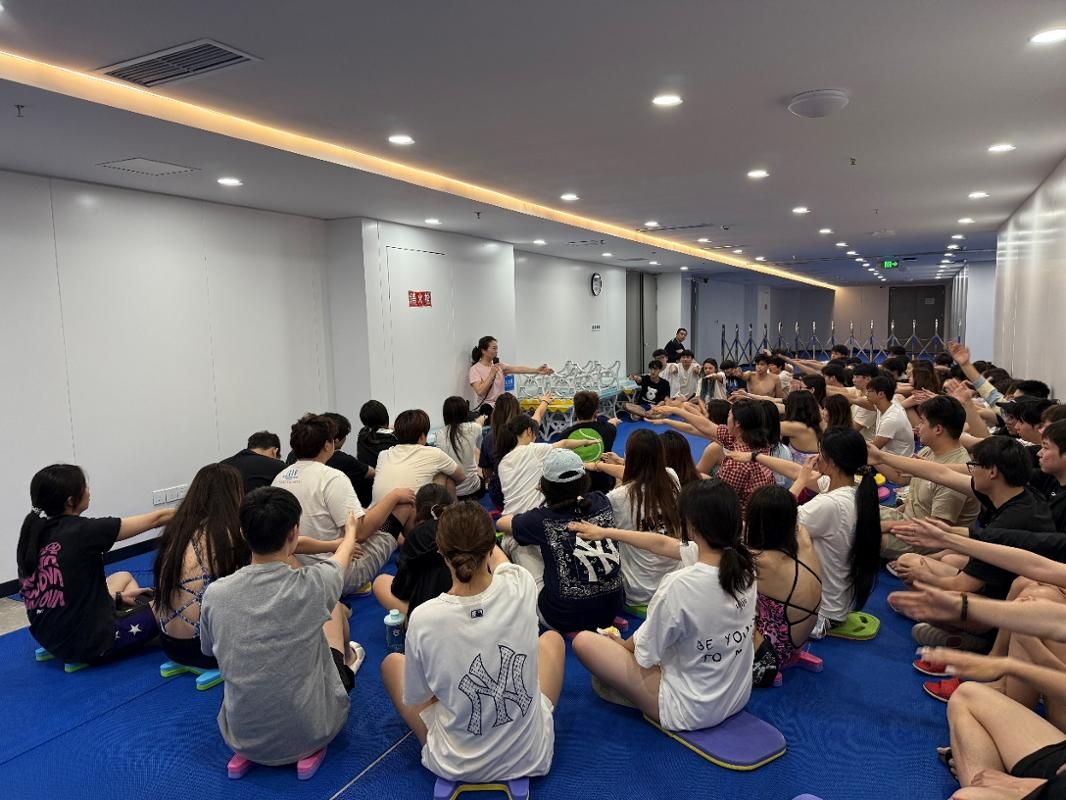 郑嘉教练首先对我国花样游泳发展史、发展现状、未来发展作了介绍;在互动环节中,与同学们就基层教练员短缺问题展开交流;最后结合公司游泳主修员工的实际情况,介绍了花样游泳陆上节奏练习的方法和水中基本动作的练习方法,并进行实践练习。